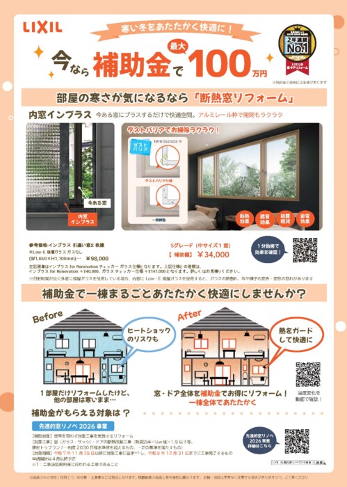 今なら先進的窓リノベ2026事業の補助金を活用してお得に断熱改修工事ができます。